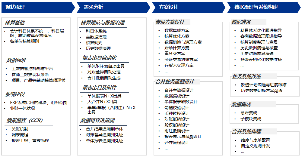 合并报表项目的建设是一个从现状梳理、需求分析、方案设计、数据治理、到系统构建的一个体系化过程,如下所示: